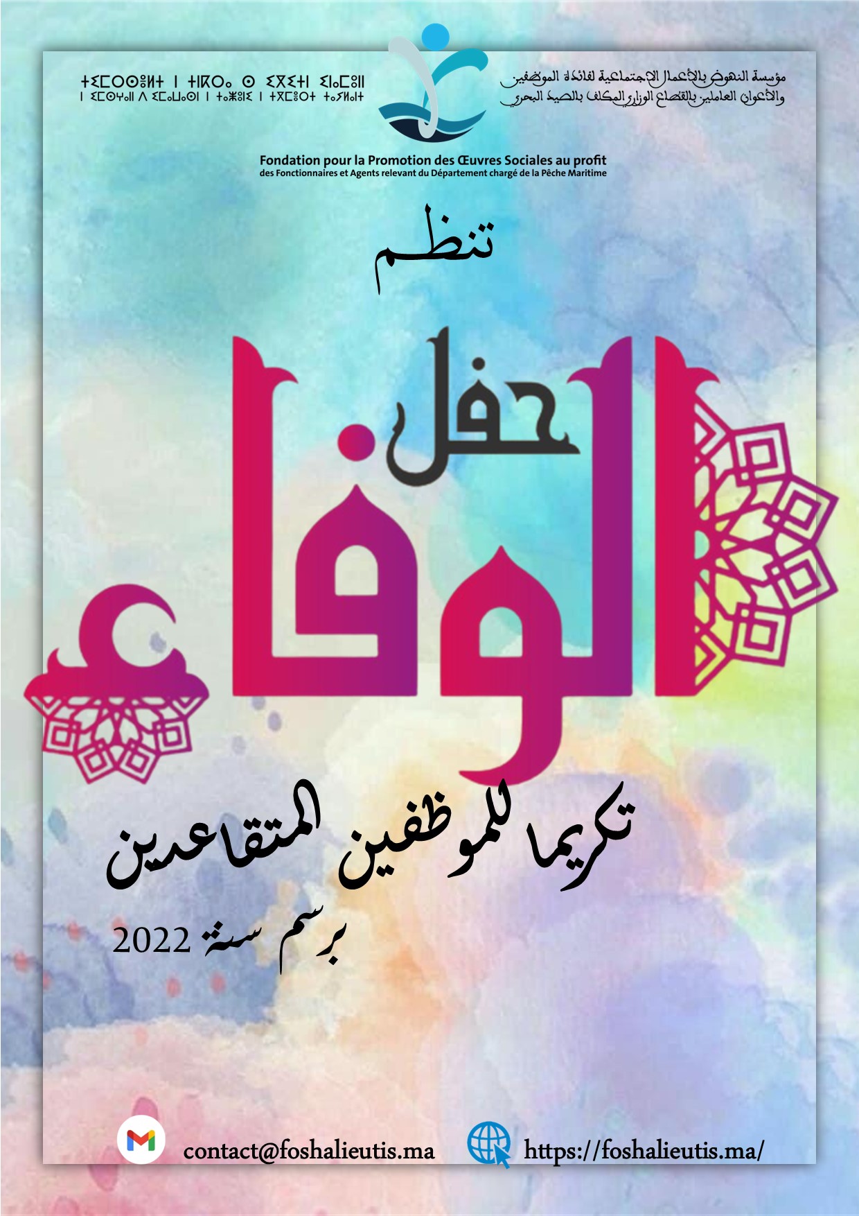 سعيا منها في ترسيخ ثقافة الاعتراف والوفاء، تنظم مؤسسة النهوض بالأعمال الاجتماعية لفائدة الموظفين والأعوان العاملين بالقطاع الوزاري المكلف بالصيد البحري يوم الأربعاء 20 دجنبر2023 حفل الوفاء تكريما للموظفين المتقاعدين برسم سنة2022 واعترافا بما بذلوه من مجهودات خلال مسارهم المهني الحافل بالإنجازات والنجاحات