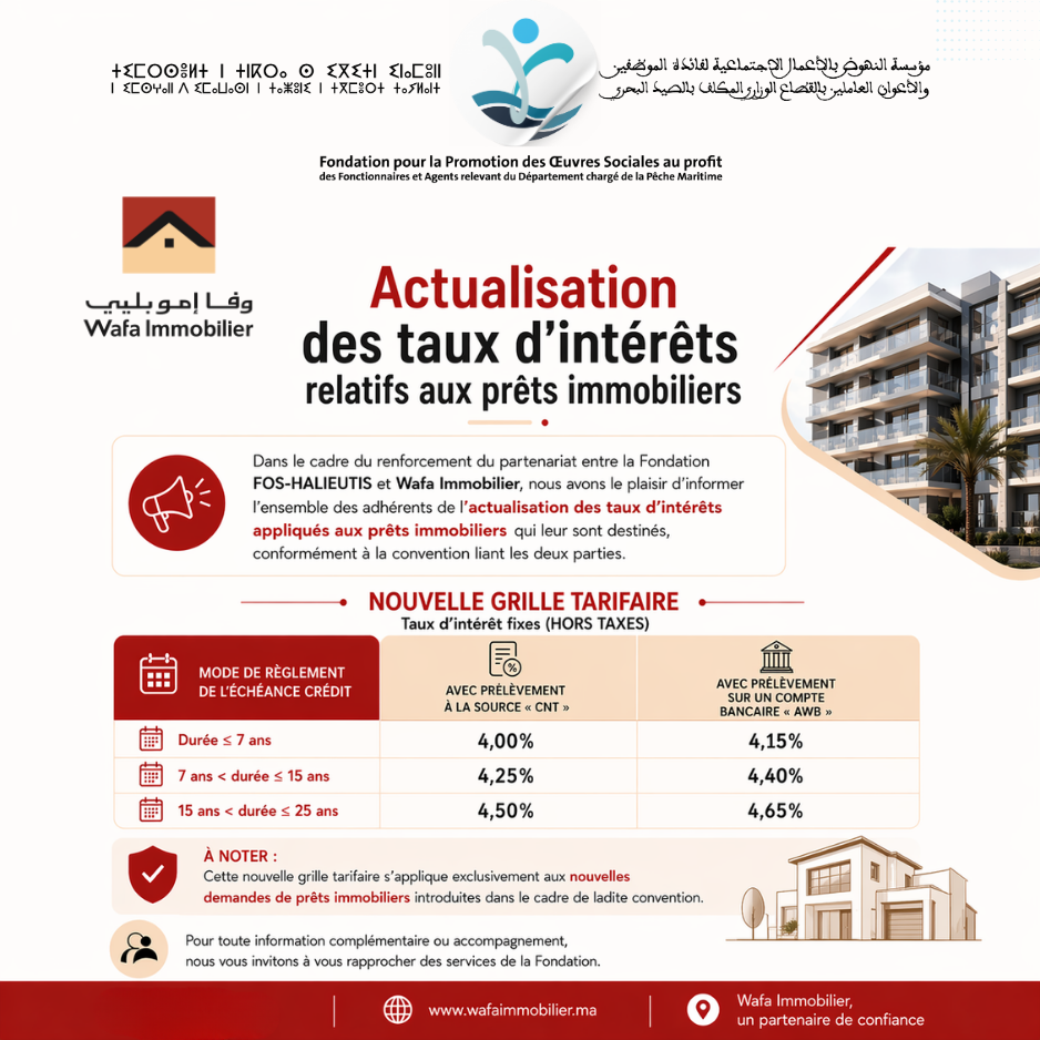 Dans le cadre de ses prestations sociales, La FOS-HALIEUTIS a signé une convention de partenariat avec WAFA IMMOBILIER qui procédera à l’instruction des demandes de prêts immobiliers, sur la base d’un dossier de demande de prêt immobilier,signé par le demandeur du prêt.