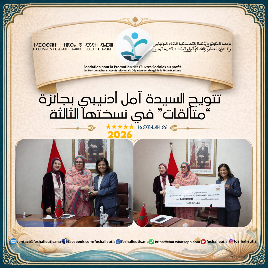 نظمت مؤسسة النهوض بالأعمال الاجتماعية لفائدة الموظفين والأعوان العاملين بالقطاع الوزاري المكلف بالصيد البحري حفل تتويج الفائزين بالنسخة الرابعة من مسابقة تجويد القرآن الكريم، في أجواء إيمانية متميزة طبعتها... Lire la suite