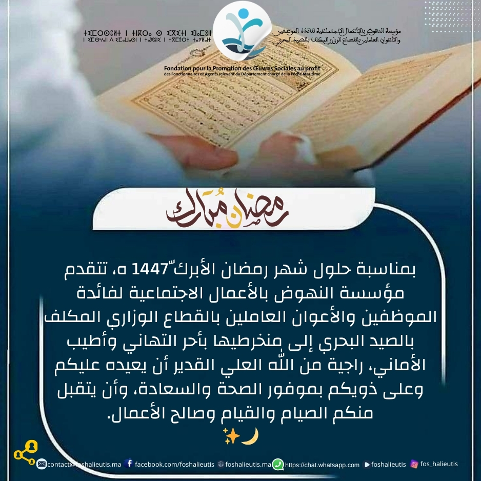 بمناسبة حلول شهر رمضان الأبرك 1447ّ ه، تتقدم مؤسسة النهوض بالأعمال الاجتماعية لفائدة الموظفين والأعوان العاملين بالقطاع الوزاري المكلف بالصيد البحري إلى منخرطيها بأحر التهاني وأطيب الأماني، راجية من... Lire la suite