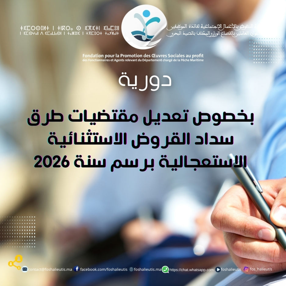تنفيذا لبرنامج عملها، واستحضارا لمقتضيات الدورية رقم 02/26 الصادرة بتاريخ 06 يناير 2026 المتعلقة بإطلاق خدمة القروض الاستثنائية الاستعجالية برسم سنة 2026، تعلن مؤسسة النهوض بالأعمال الاجتماعية لفائدة الموظفين... Lire la suite